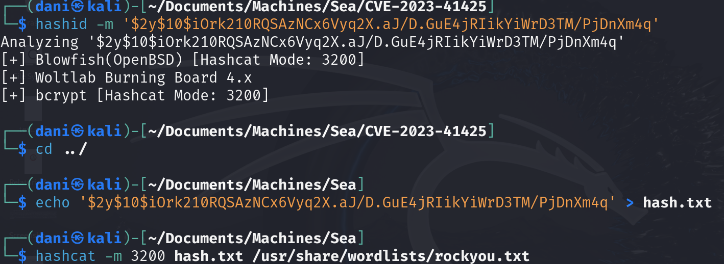 hashcat -m 3200 hash.txt /usr/share/wordlists/rockyou.txt